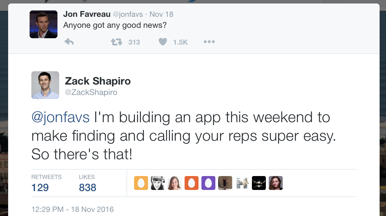 After a pretty crappy week, Jon Favreau, from the podcast Keepin’ It 1600, asked if anyone had good news. I shared that I was about to start working on a small app. I didn’t realize how big of a need this was until he retweeted me. And again, my replies exploded with people who wanted to get involved.