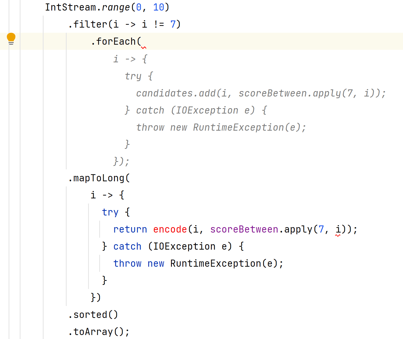 Here’s a slightly more involved example from test code, where I started off writing the loop as a mapToLong but then changed my data structures so that it ended up being cleaner to invoke a method with forEach instead. Copilot had my back:
