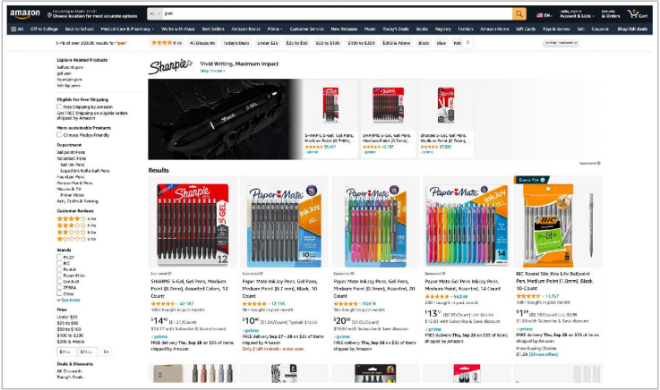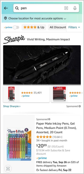 81. There are more than (redacted) different products available for sale on Amazon. To navigate (redacted) product catalog, Amazon offers a search bar. When shoppers enter a search, Amazon’s systems generate a “Search Results Page“ that displays product listings interspersed with advertisements (discussed in more detail in the next section). Product listings on the Search Result Page typically show a name, picture, price, star rating, shipping speed estimate, and Prime status (or lack thereof) for each item, as shown in Figures 3a (desktop) and 3b (mobile).