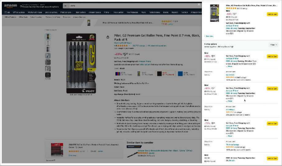 87. Amazon makes it similarly difficult for shoppers to make a purchase when Amazon has removed the Buy Box from an item’s Detail Page. Amazon’s page layout prevents shoppers from adding to a shopping cart or buying any offers directly from the Detail Page, as shown in Figure 6a.