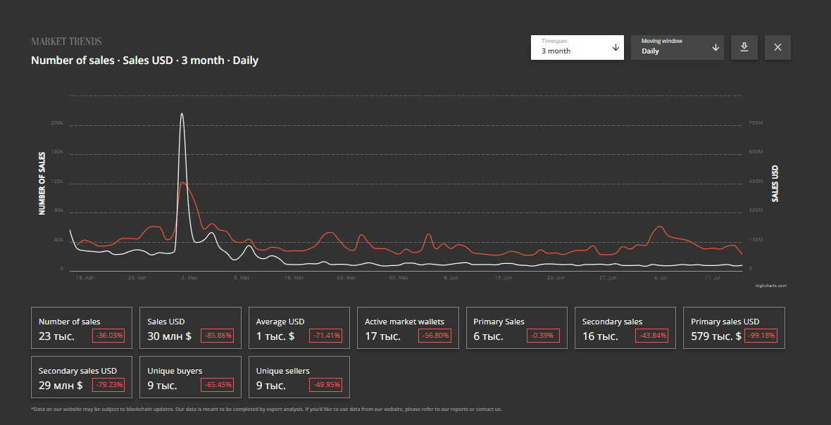 Against this backdrop, the NFT sector took a hit. Trading volumes of non-fungible tokens are moving steadily toward a yearly low. NonFungible statistics show that on July 15, the daily sales volume was 28 920 transactions, while trading volume in the NFT market collapsed to the $35 788 508, 28 mark.