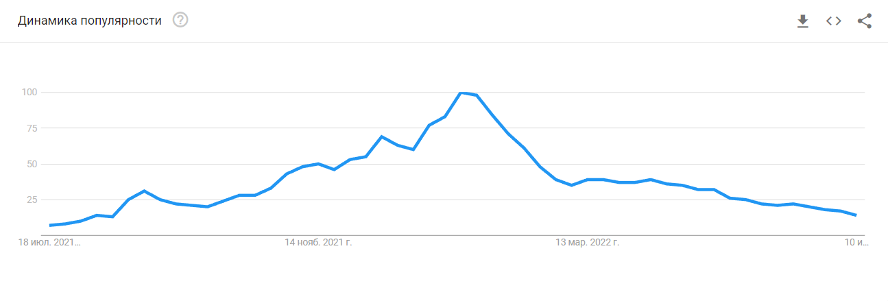The Google Trends analysis of the NFT request shows that the peak interest (100) for non-fungible tokens was in January 2022, after which the hype passed. As of June 15, the popularity of the NFT query is 14 - the number of searches has decreased by more than 85%. This trend suggests that scam projects will leave the market - the industry will be cleared of "passengers" opening up new prospects.