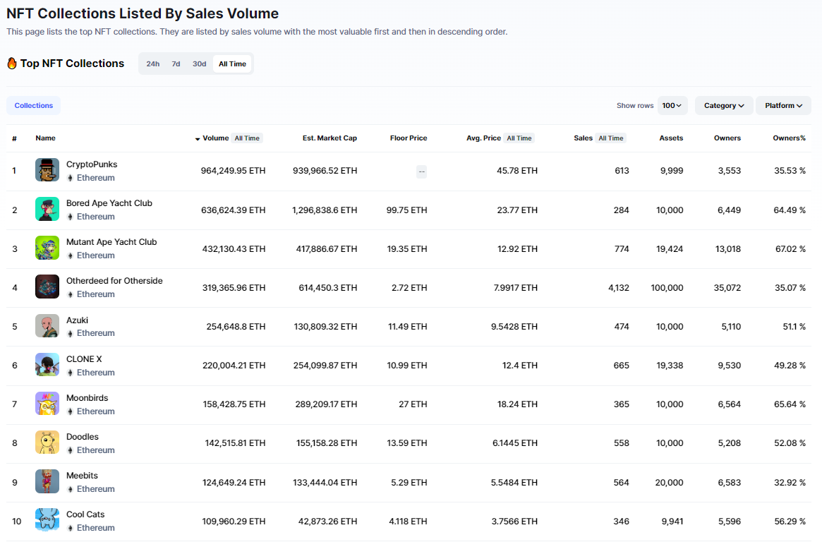 The representatives of the top NFT collections always provided the basic mass of the trading volumes of the market. Their value varies from a few tens to several hundreds of ETH. In the Coinmarketcap ranking, the top 5 NFT collections by capitalization look like this: