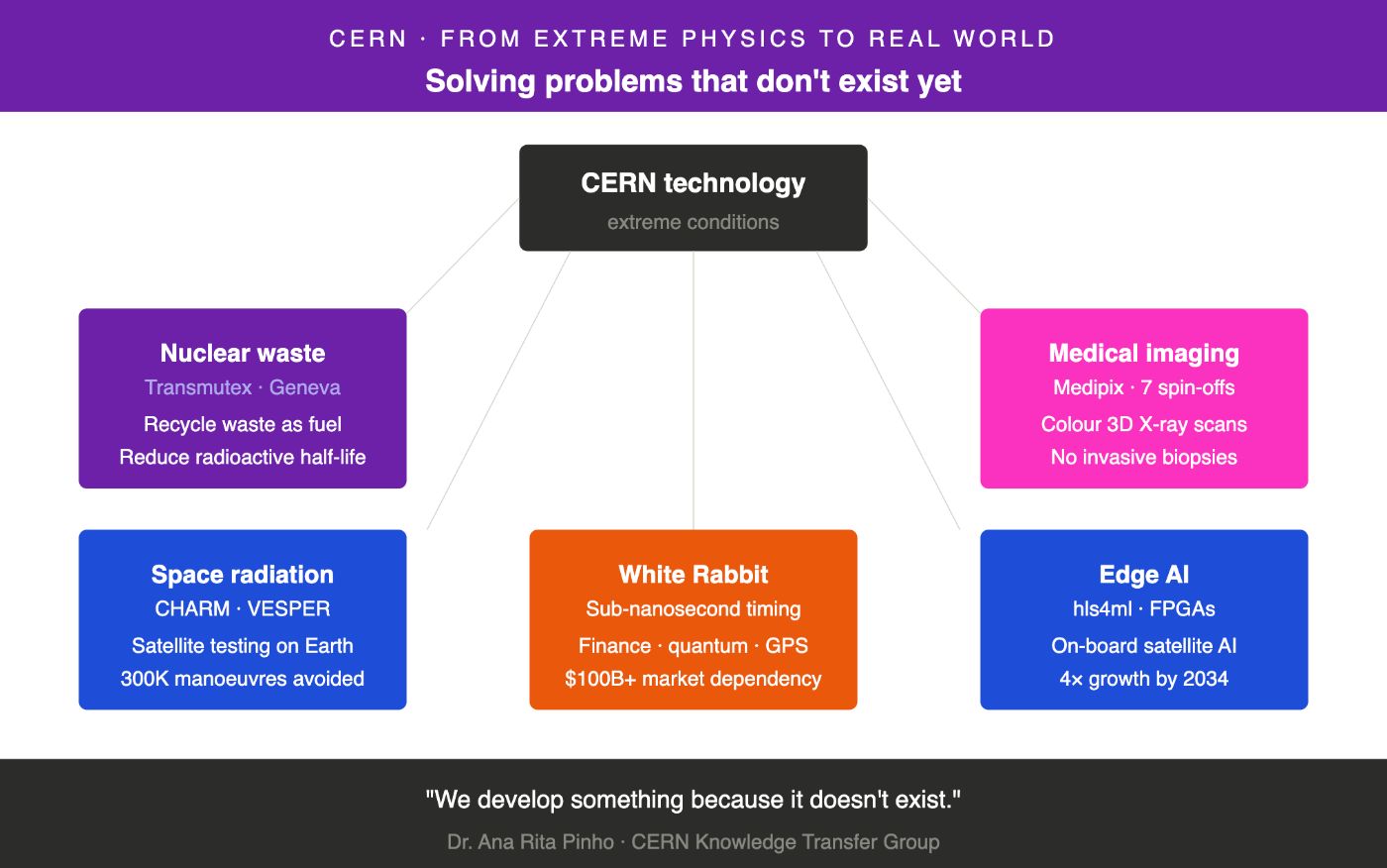 CERN people “know that if we develop something, it's because it doesn't exist,” shares Dr. Ana Rita Pinho, a Strategy Support Team CERN Aerospace and Environmental Applications Coordinator at Knowledge Transfer Group. Technologies that handle extreme radiation and enable extremely accurate time synchronization are needed far beyond CERN's premises on the French-Swiss border.
