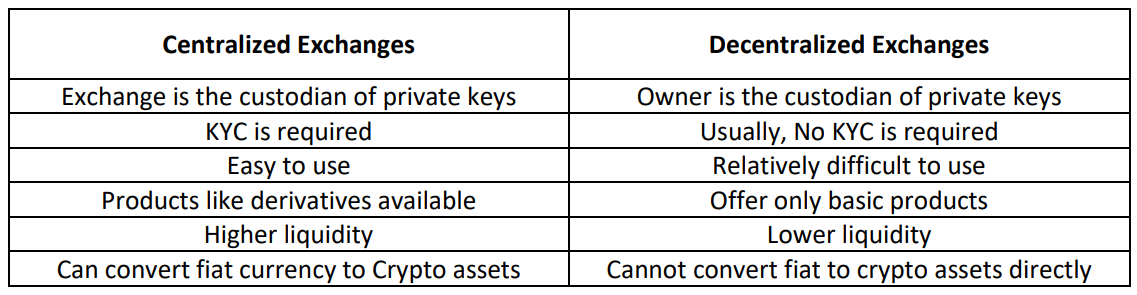 The Bitcoin Blockchain allows users to transact 24x7 using wallet software which facilitate signing and broadcasting transactions to be included in blocks that get added to the Bitcoin Blockchain. However, Bitcoin owners also have two other fundamental requirements of being able to convert fiat currency into crypto assets and vice versa, as well as exchanging one crypto asset into another. The crypto exchanges provide these facilities and many more to the owners of crypto assets. In this ecosystem the exchanges can be divided into two categories, centralized and decentralized exchanges. The major differences between them are: