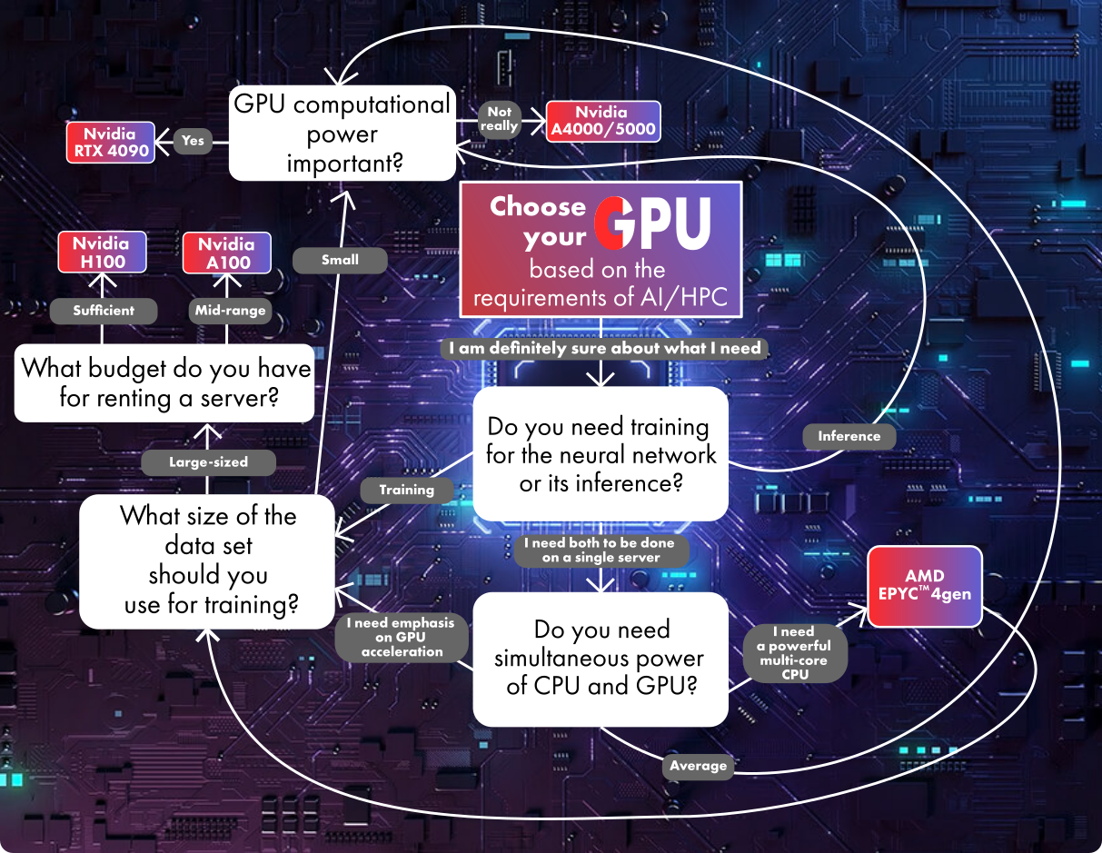 Considering all these factors and taking into account software optimization for HPC and AI, we recommend servers with Intel Xeon or AMD Epyc processors and GPUs from NVIDIA. For AI inferencing tasks, you can use GPUs from RTX A4000/A5000 to RTX 3090, while for training and working on multi-modal neural networks, it's advisable to allocate budgets for solutions from RTX 4090 to A100/H100.