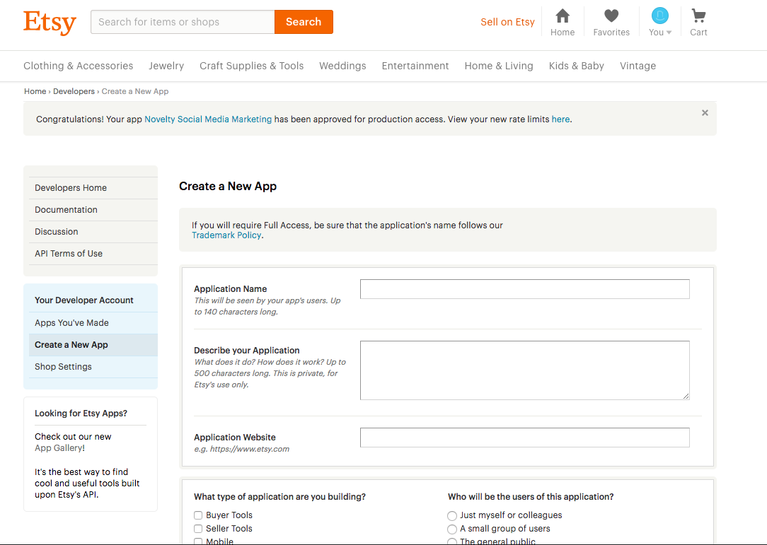 I first started by creating an App using Etsy’s developer platform. Etsy offers a way for developers to easily access their API. They give you basic access using an API key so that you can get started working right away.