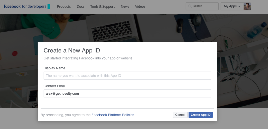 Around this time, a few other areas of the product began to take shape. First, In order to create Facebook Ads I needed to create a Facebook app using their developer platform. So I went to www.developers.facebook.com and began the process. You have to create what they call an App ID.