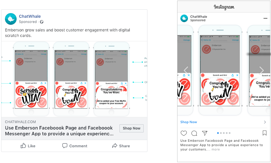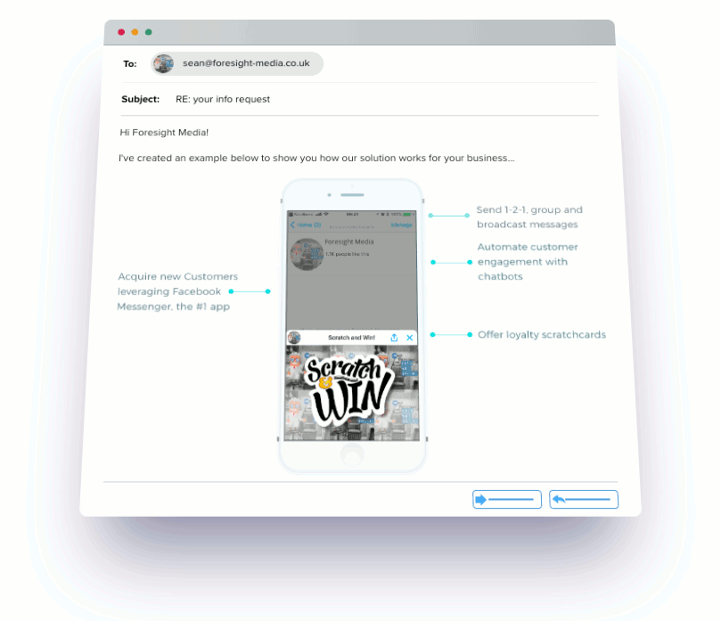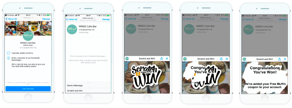 The example above and the series of images below shows the business how using their existing FB messenger they can use digital scratch cards to deliver customer engagement. Each image is customised to the recipients business branding etc.