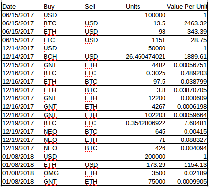 To start, we need to create a tradesheet that emulates how we invested our portfolio. The one below is included in the repo. These are actually the same cryptos I invested in and the times I bought and sold them up until now, but the amount of money and the allocations (i.e., the amount I bought and sold) are not.