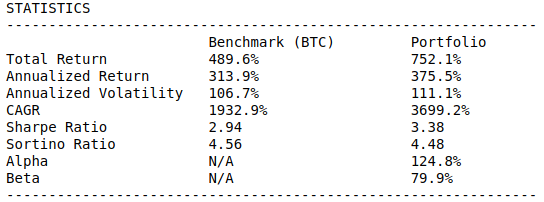 And while we can compute all the statistics under the sun to measure our portfolio’s performance, it doesn’t do much good if we don’t include a reference point to see how well we’re doing in comparison. This is called a benchmark, and we’ll be using the golden boy of cryptocurrencies: Bitcoin.