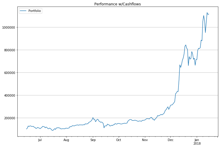 Well that’s intimidating. The above chart shows how the USD value of our portfolio evolved over time including all of our cash flows (i.e., deposits and withdrawals). While it’s nice to visualize this, it’s hard to get a clear idea of how our portfolio did in true performance when cash flows are included. For example, if I deposited $1 million (I wish), the portfolio would appear to have a HUGE spike!