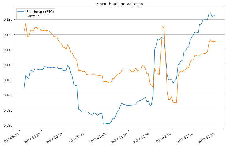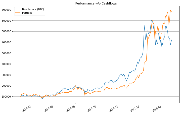 Now that’s better. By removing the daily returns when cash flows were witnessed, we have a more accurate representation of the true performance of our portfolio. Fortunately, we have a very small number of cash flows, so this method is acceptable. As you can see, it took us some time to catch up to Bitcoin, but it did and eventually surpassed it (thanks Golem and NEO).