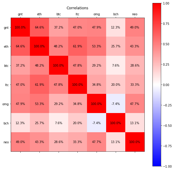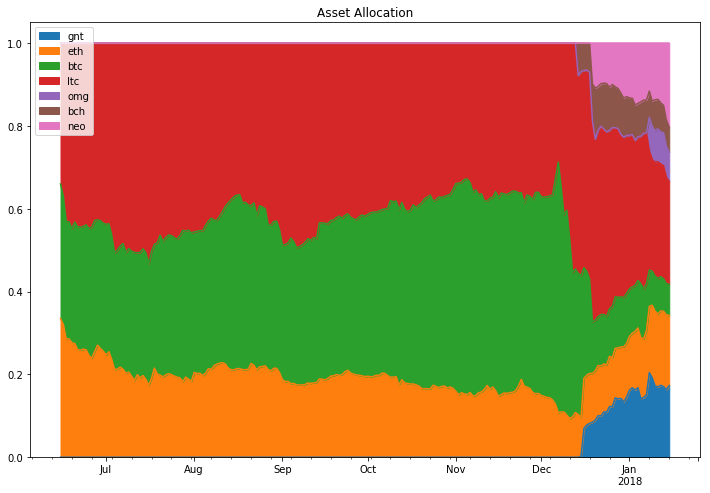 For me, this is the most interesting plot. This is a matrix that represents the correlations between all of the assets in our portfolio. While a lot of assets had a medium to high correlation with one another, Bitcoin Cash had a very low correlation to every single asset. You can even see that it was negatively correlated with OmiseGO! Correlations do change over time, but it’s nonetheless interesting to see these types of relationships within our portfolio.