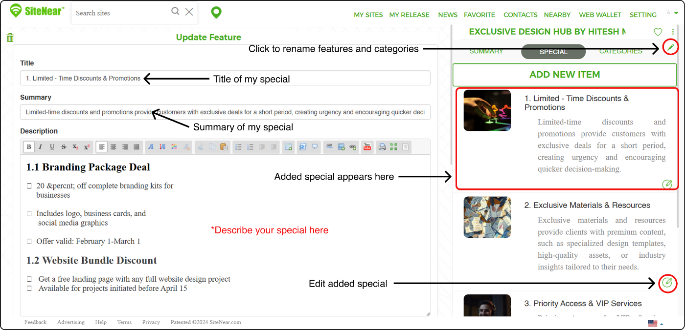What I love most about SiteNear is how flexible it is. The sections are represented as categories or features. You can organize your site however you want using categories and features—no tech skills needed! There is no learning curve—anyone can use it instantly.