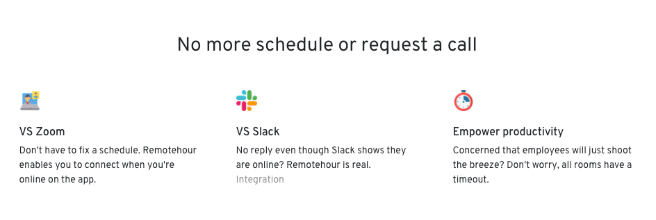 Also added “You don’t have to schedule or request a call” to a pitch. I suppose it’s the one of the most efficient ways of describing your product to be compared to other similar applications. Nothing is more seamless than Remotehour.