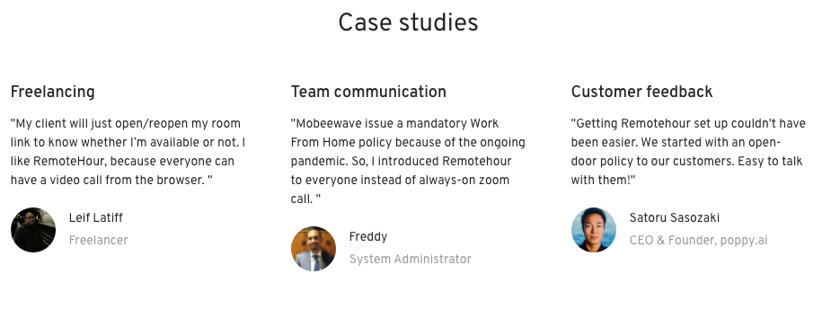 It’s Remotehour. This is a web call app that allows your clients/customers to talk anytime you’re available while working. When it comes to a calling app, you may imagine Zoom and Google Hangouts at first. With these apps, you have to schedule a meeting with participants beforehand. Or, a third party call app like Slack and Messenger. It lets someone request you, and get a call if you can respond. Remotehour is neither.