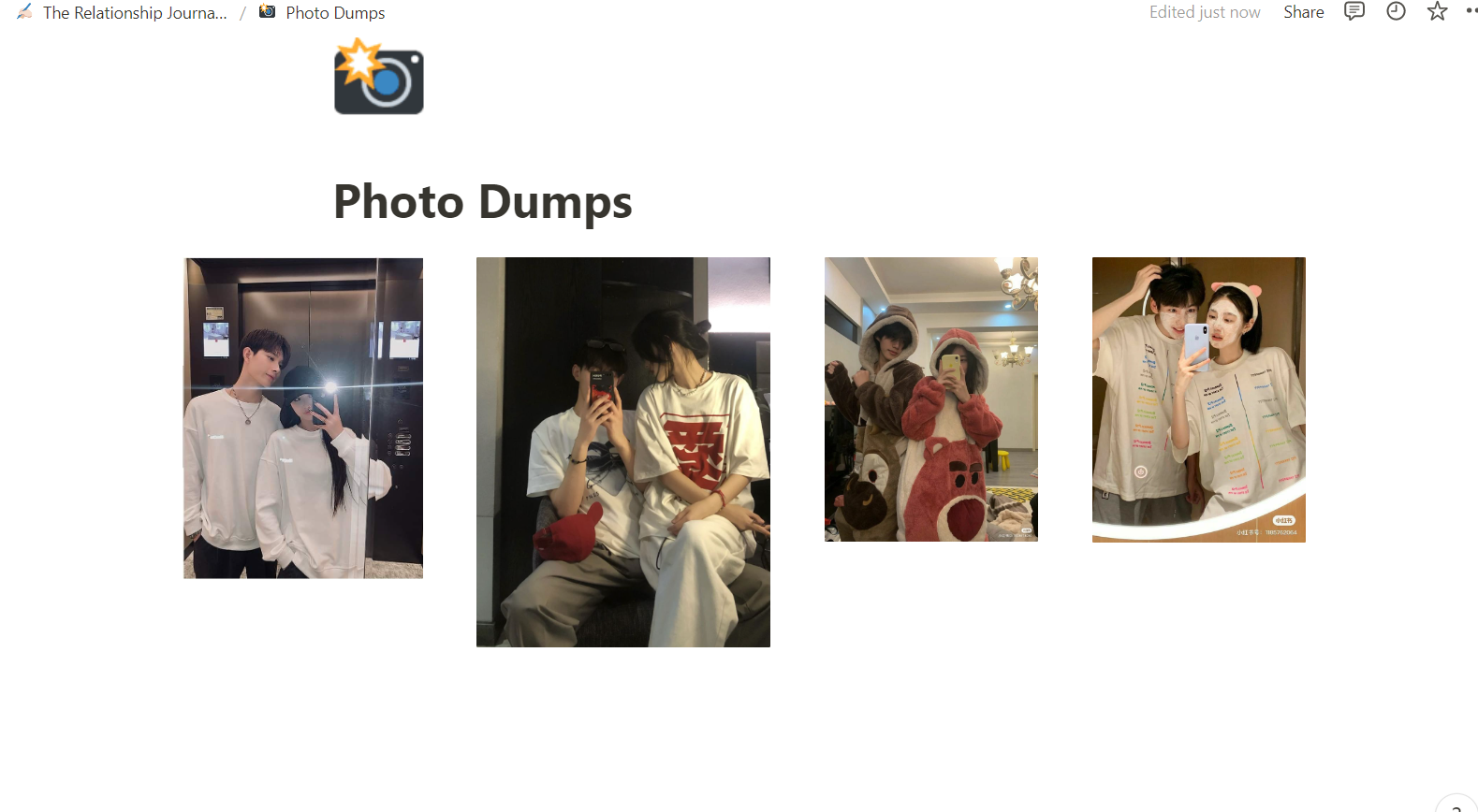 We love pulling out the camera from picture-perfect moments to embarrassing ones. My partner and I upload the everyday grinding pictures on Notion that speak of the sweetness and sourness of our relationship. Those shared little moments weave a remarkable visual memoir for us to look back at. The above image of photo-dumps is shared by one of our customers.