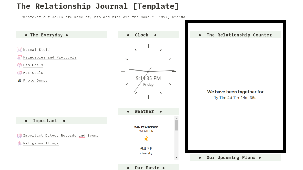 We added our Spotify playlist on Notion and it helped us to build the Relationship Journal while listening to music. Set the mood for your partner in a few easy steps. We love to add our personal favorites and also the tunes that recall our sweet memories. On birthdays and anniversaries, we set up special playlists separate from the usual ones and dedicate them to each other.