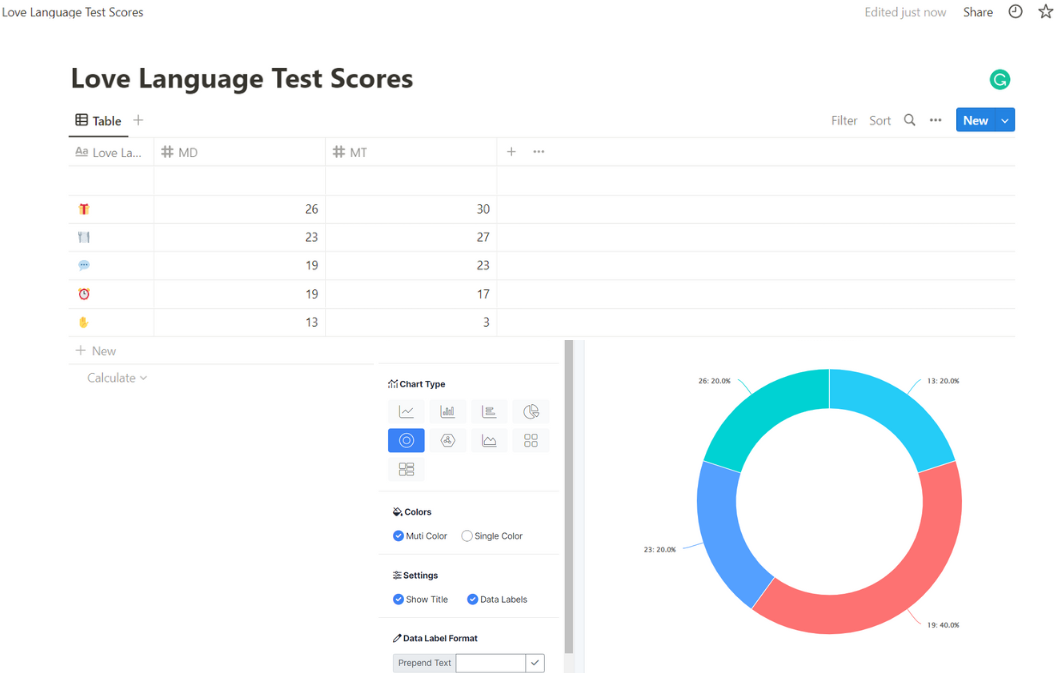 Respecting each other’s preferences goes a long way in retaining a relationship. Noting down the love language scores will give a clear idea about what you and your partner like to receive in the form of love. For fun, you can also add charts (bar, line, column, and pie) to keep track of the fluctuations.