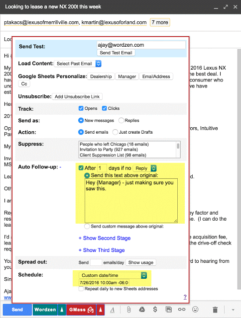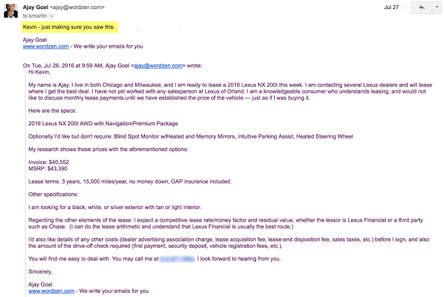 Last year, I created a Gmail extension called GMass that allows you to send mail merge campaigns right from your Gmail account. Last month, I used it to not only buy a new 2016 Lexus NX 200t, but to ensure I paid the lowest possible price.