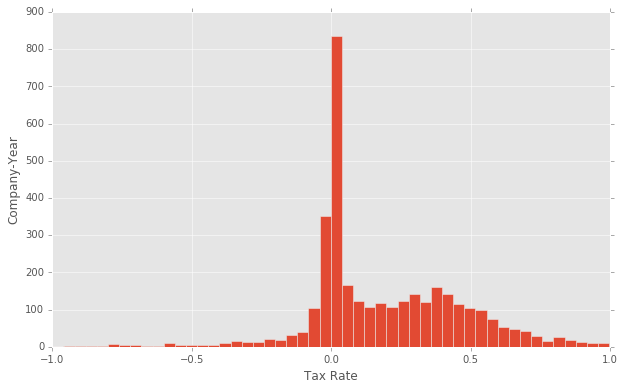 The dataset covers from 2011 to 2016 filings of over 8500 publicly traded companies, of which 1344 had complete reporting of income and tax paid. Each dot in the graph represents a company-year. Note that these are not all U.S. based companies and the tax scheme may vary based on domestic/foreign income etc.