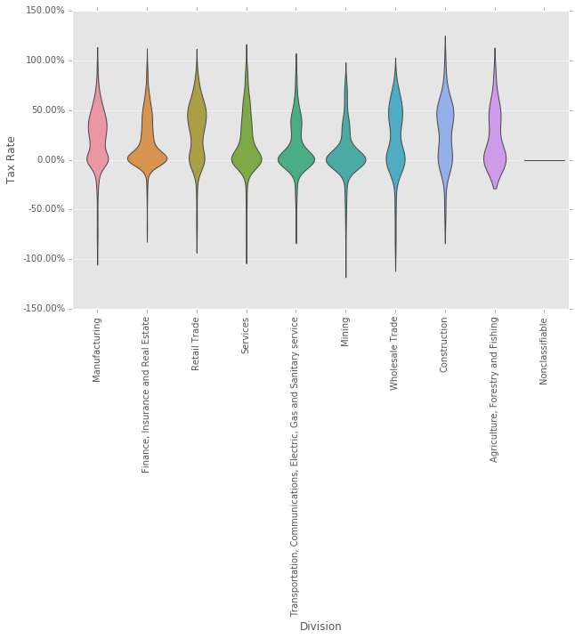 I’m surprised there were visible difference between them. Manufacturing and retail actually align with the 35% baseline better than other industries for some reason. The overall tax rate distribution looks like this: