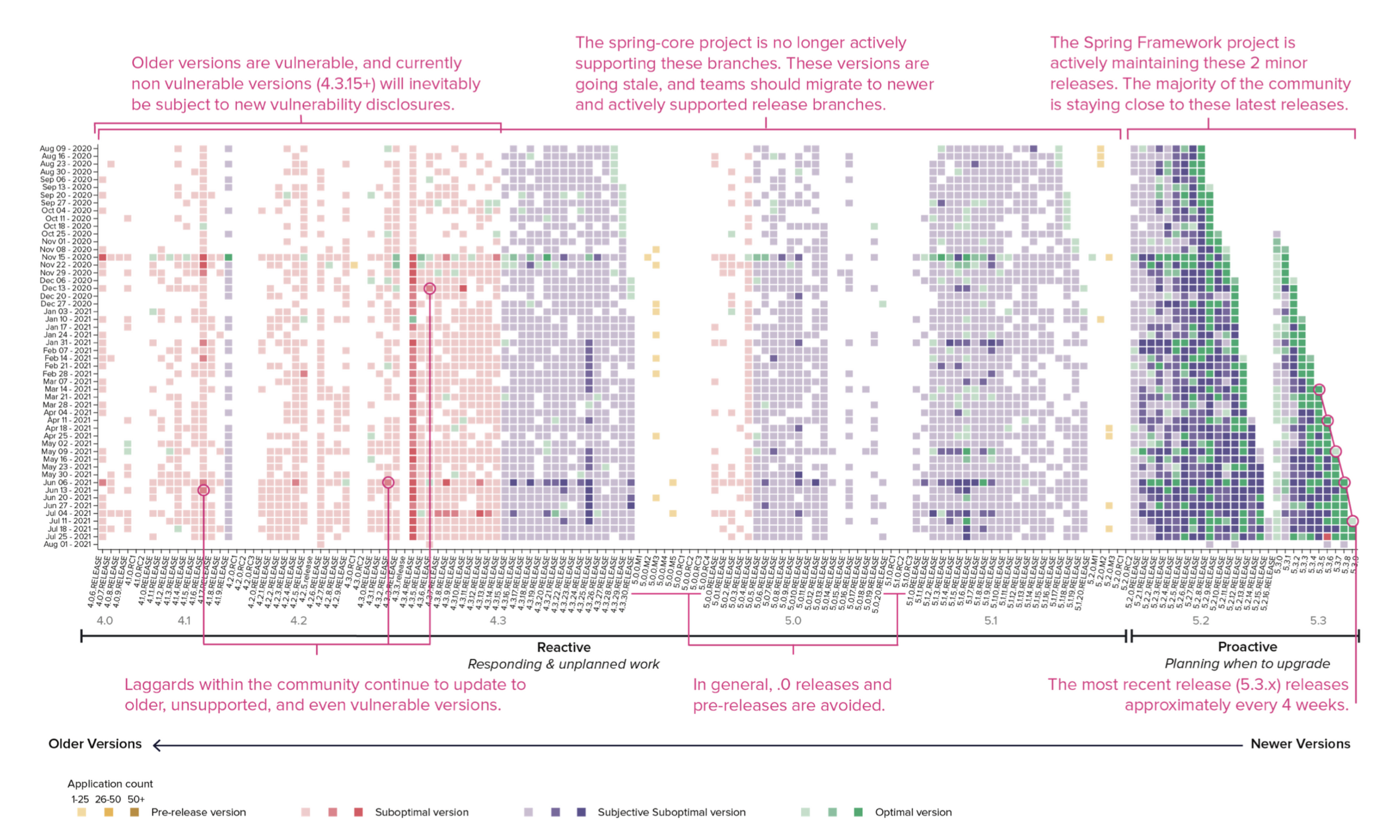 Above is an example of a single project’s versioning history and the behavior of the global developer community as they aim to choose the optimal versions. Although it’s common best practice in software development, our research findings found that, on average, the optimal version to choose is typically 2.7 versions back from the latest “bleeding edge” release, likely because they’ve been accessed and updated for security vulnerabilities.