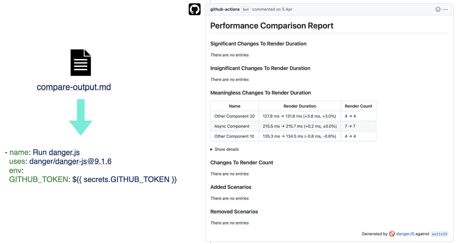 To ensure a delightful Developer Experience, Reassure integrates with GitHub to enhance the code review process. Currently, we leverage Danger.js as our bot backend, but in the future, we’d like to prepare a plug-and-play GitHub Action.
