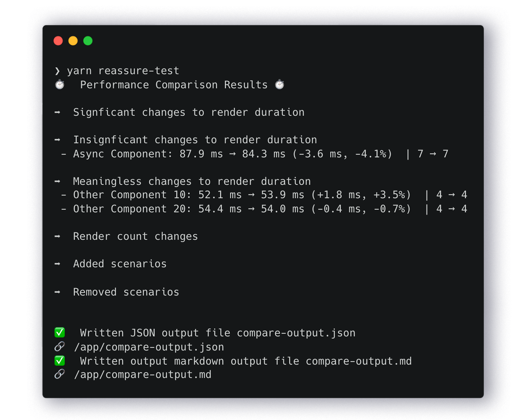 Having all that data, Reassure can present the render duration times as statistically significant or meaningless.