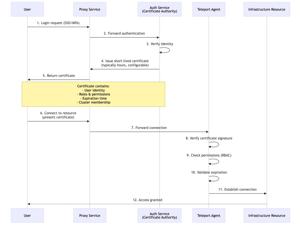 Teleport addresses these challenges through a certificate-based authentication model, unified access proxy, and comprehensive audit logging.