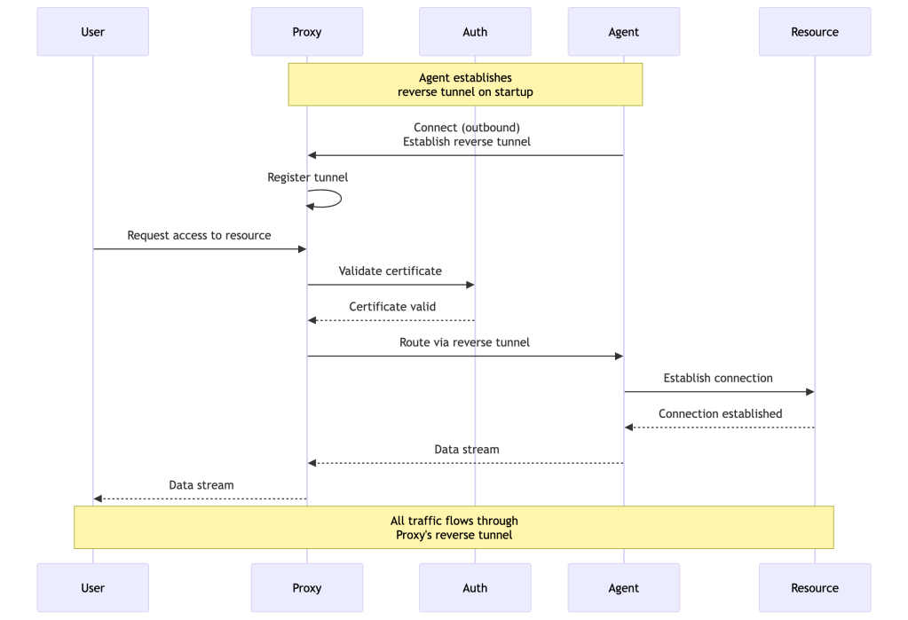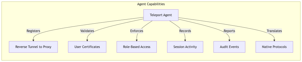 Mental Model: Teleport = Identity-aware access proxy + certificate authority + audit system. Users authenticate via SSO, receive short-lived certificates scoped to their roles, and connect to resources through a proxy that routes traffic via reverse tunnels from agents. No standing credentials. Every session recorded. Access determined by identity, not network location.