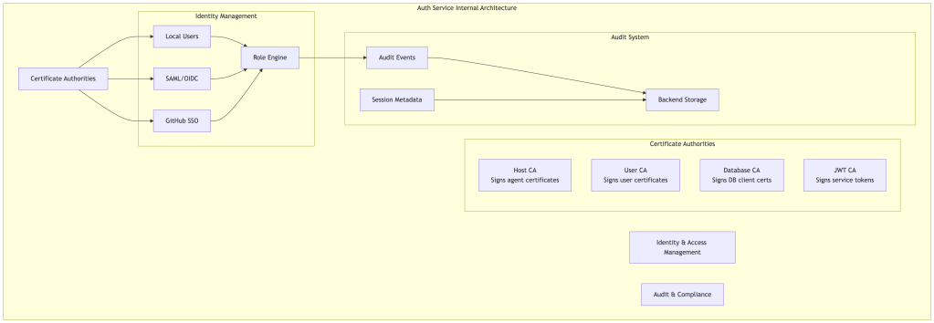 - Certificate-Based Authentication: As covered in the architecture section, short-lived certificates eliminate standing credentials — but authorization still depends on centrally issued roles, and revocation requires CA rotation or lockout, not a simple flag.