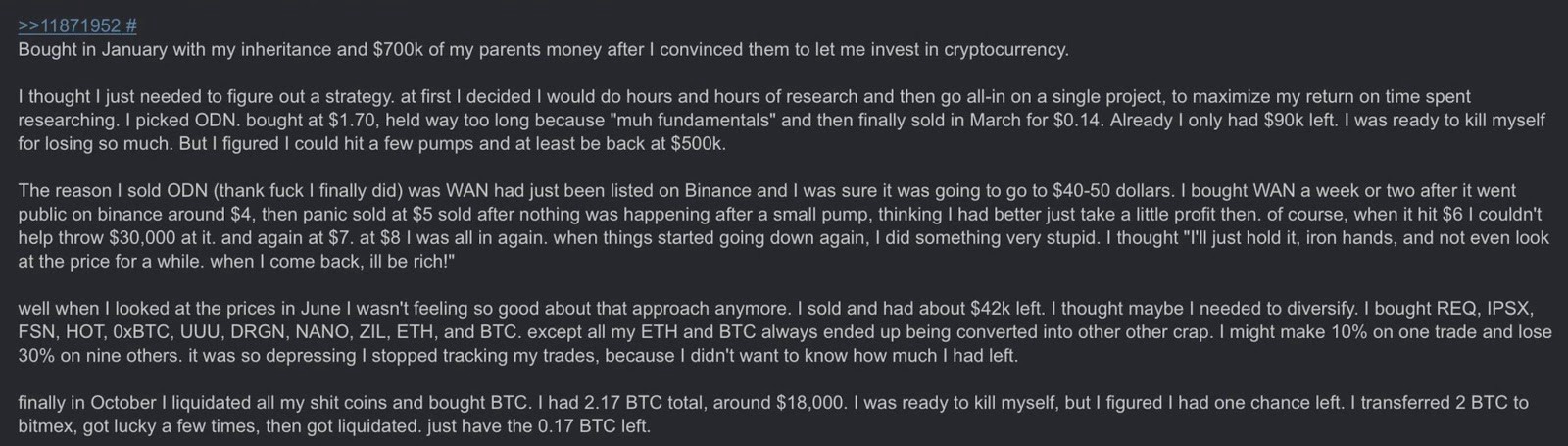 Last year when the prices were reaching all-time highs every week it was easy to be a cryptocurrency investor — you just buy and hold. Nowaday’s if you held your Bitcoin through the year you as an investor would see a decrease of 80% measured for the January’s high at $171441 to the current levels on which the crypto is being traded which is at $3368.
