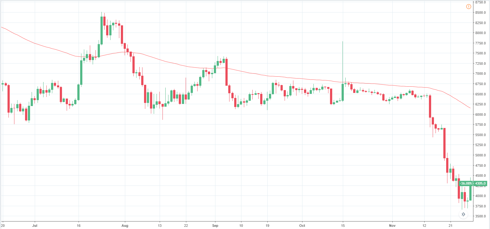 On the chart above you can see that the Bitcoin’s price bearly moved by 5% up and down from the mid-range at $6596 which lasted from 8th September to 14th of November.