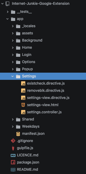 For app logic I have everything in background.js (in background folder) that I converted into a module that I’m planing ot split in smaller modules in the future. Browserfy helped me to bundle everything and I added Jest for testing.
