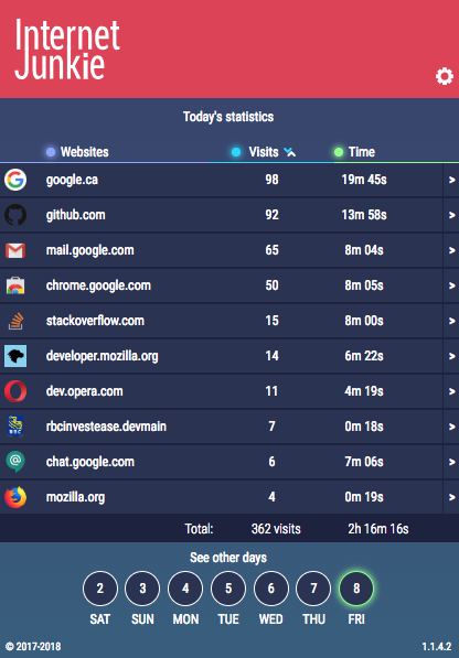 Internet Junkie, your best internet time tracker. Track how much time you spend on the browser and analyze how productive you are online. Internet Junkie shows statistics on your top 10 visited websites for a full week!