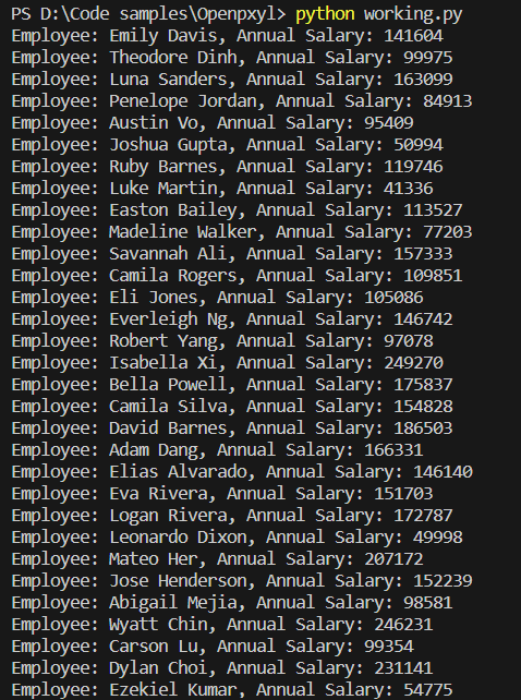 Suppose you want to display all employees' full names and annual salaries stored in columns B and J, respectively. Python can help you achieve this task with the following code: