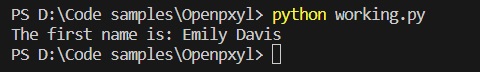 One of the easiest ways to prove that the above code opens the file is to access and display a cell value. Let's print the full name of the employee in cell B2. To access a certain cell value, you must first access the sheet it belongs to. In this case, the name of the sheet is Data.