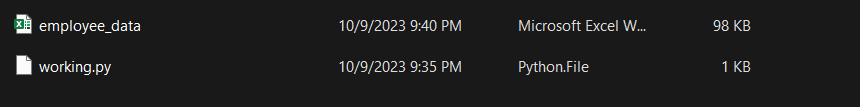 Let’s start with accessing the Excel sheet we downloaded earlier to show how to load an Excel sheet on your local machine. Here is the folder structure of my project. Both the employee_data file and the working.py file are in the same directory.