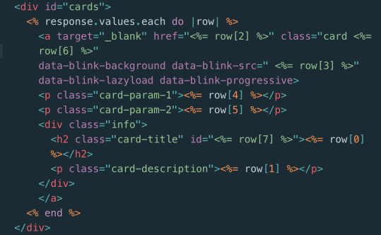 Finally, I got to the fun part of actually inserting the data from the sheet into my views. In just 12 lines of code I created a simple little ruby block that creates a card of information for every single conference in the spreadsheet, regardless of how many conferences I add: