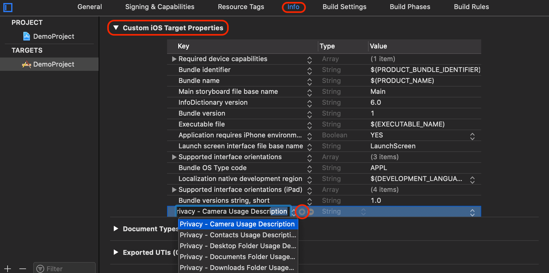 - Open Xcode, select the target object, and then click Info > Custom iOS Target Properties.