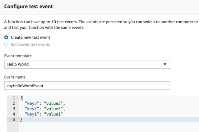 The preceding code prints the whole event that triggered the AWS Lambda function (which is commented out). Then it prints three different keys from the event, named key1, key2, and key3 and finally returns key1. When you test this AWS Lambda function through the console, you need to make sure that the test event has these three keys defined.