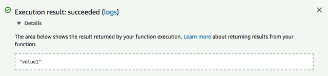 In the console, you will also see the value of key1 logged, which in this case is value1, since that is what was configured in the test event: