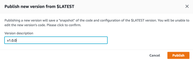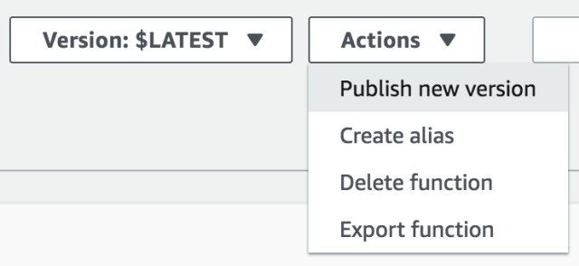 - In the AWS Lambda Console, click on the Actions dropdown and select Publish new version: