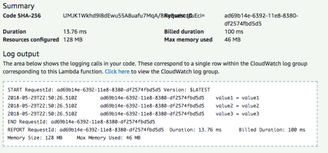 If you navigate to the CloudWatch Log Group link that is available in the Summary, you can view the logs that are generated by your AWS Lambda function. In this case, the function outputs the three different values of the keys that are configured in the test event used to test the Lambda function: