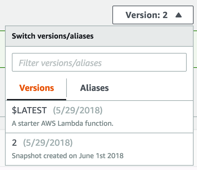 You can see the available versions for your AWS Lambda function by selecting the Version dropdown: