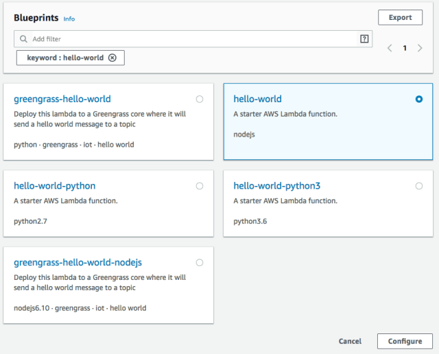 You should see A starter AWS Lambda function in Node.js. Click on the Configure button at the bottom: