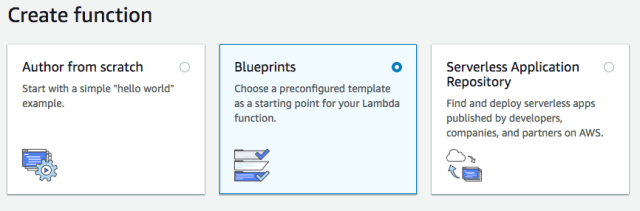 Once you have clicked the button, you will be presented with three different options to create an AWS Lambda function: