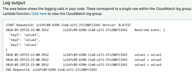 In the output of your AWS Lambda function execution, you should now see the whole event printed, along with the values of each key: